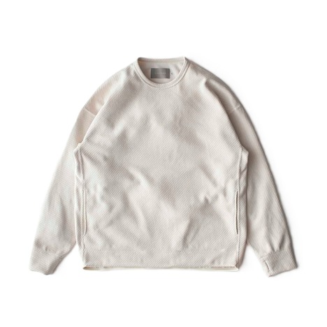 リサイクルポリエステルのモール糸で編み立てた、表と裏の見え方が異なるクウォーターゲージニットを用いたクルーネックプルオーバー。
